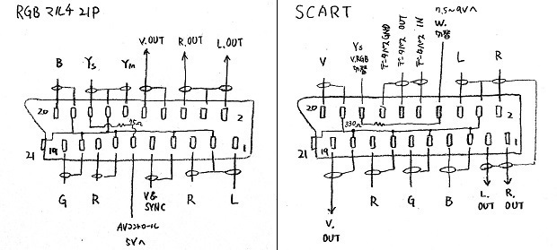 のですが、日本のRGBマルチ21ピンと海外のSCARTではコネクタの外観は同じだがピンアサインはまる