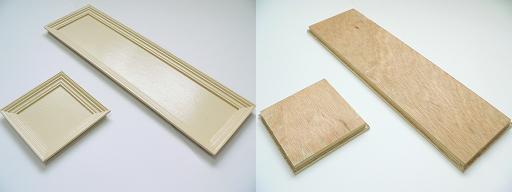 モールディング加工をします。それを額縁状に組みます。出来た枠内に薄いベニヤ板を張った後、塗装を