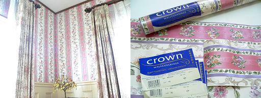 さて、腰板を張るなら、壁紙も貼り替えるチャンスです。主催者は縦縞、花柄、原色使いで雰囲気の