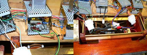 右の写真は前面パネルを取り付け、配線を行ったところです。下にあるのは電源トランスです。