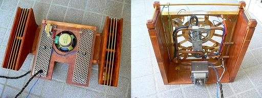 左の写真は後側のパネルにスピーカーとダクトを取り付けたところです。これを後側に差込みます。