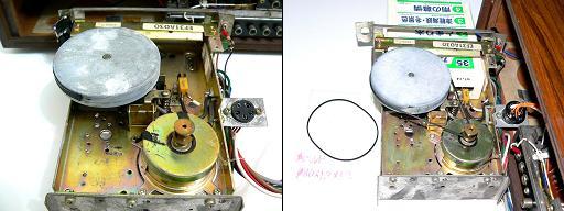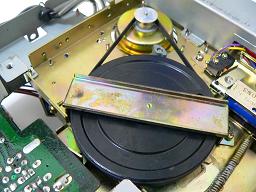 と比べるとシンプルな構造です。テープを送る軸(キャプスタン)の裏に大きなフライホイールが