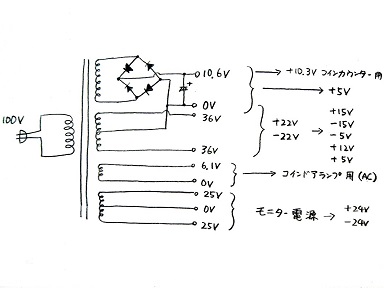 10.3Vはコインカウンター用で、電源回路を通らずそのまま出力されます。次の36Vは電源回路に