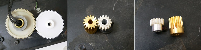 軸穴の加工等は必要ですがたぶん使えると判断。今回の使用法ではギアの組み合わせは一段で、しか