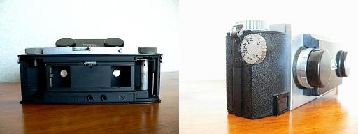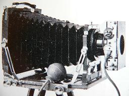 このカメラの先端には何やら四角い箱が付いています。これは実はシャッター。古いカメラの