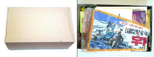 去に土産物やらオマケを入れていた箱。右の写真が開けたところ。一番上にあるペナント(宇宙博)は