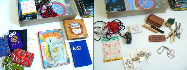 箱の中身は・・・。お守りとかハンコとか名札とかが多い。怪獣大じてんが一冊、それから600こちら情