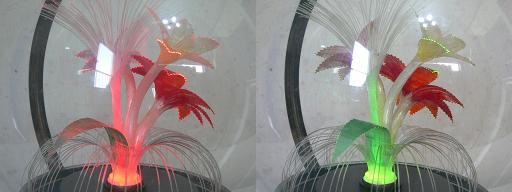植物に見立てた部分全体もゆっくりと回転します。光ファイバーの断面(花びらの縁など)が