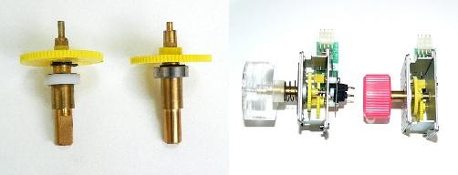 合、ノブ軸に付いている歯車のすぐ上にEリングが付いています。Eリングを外すとノブ自体が上下に