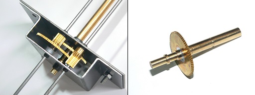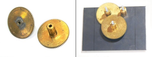 加工が出来る真鍮製を選んだ訳です。下の写真左が大小のギアを組み合わせて2段ギアにしたところ。